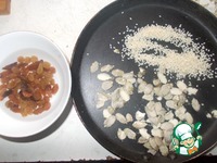 Изюм залить горячей водой. Кунжут и тыквенные семечки поджарить слегка на сковороде. |