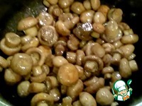 Добавляем в казан масло ( буквально 2-3 столовые ложки) и включаем плиту на всю мощь. Жарим грибы до испарения влаги и до получения золотистого цвета. Солим и перчим. перемешиваем и выключаем плиту. |