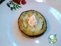 Складываем пирамидку. Сначала баклажан. На него, по центру, каплю майонеза. |