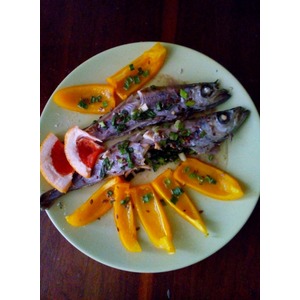 5. Сбрызгиваем рыбку соком грейпфрута (можно лимоном, но его не оказалось, а так еще интереснее получилось), и немного оливковым маслом.