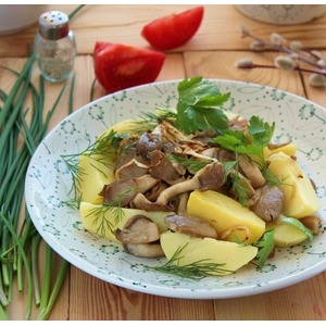 Когда картофель будет готов, воду слить, на картошку выложить грибы с луком и тушить минут 5, чтобы картофель пропитался грибным соусом. Посолить, поперчить по вкусу. При подаче посыпать зеленью. |