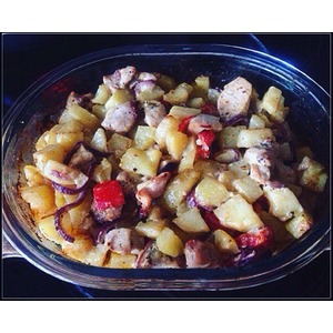 Заливаем в пищу соус и опять перемешиваем. Ставим запекать до готовности, перемешивая каждые 15 минут, что бы не сгорело. |