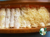 Так поступить со всеми блинчиками. Сложить их в форму, смазать сметаной и равномерно посыпать тертым сыром. |