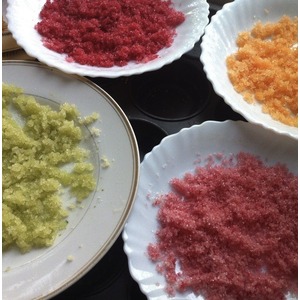 Натереть свеклу на мелкой терке, отжать сок через марлю. Добавлять сок в сахар по капле, растирая пальцами. Оставить на столе для просушки. Перемешивать время от времени. |