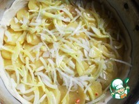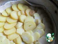 За это время готовим начинку. Отвариваем картофель, остужаем, чистим и нарезаем кружками толщиной 0,5-0.7 мм. Грибы моем, режем и обжариваем в растительном масле с добавлением соли и перца на ваш вкус. Я брала для начинки грибную икру. Лук нарезаем четвертькольцами. Можно замариновать его, а можно и так использовать.