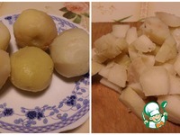 Отваренный картофель очищаем и нарезаем кубиком. Морковь также нарезаем кубиком. |