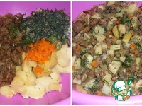 В чашку выкладываем обжаренные грибы с луком, добавляем картофель, морковь, нарезанную зелень. Добавляем соль. Перемешиваем. Начинка готова. |
