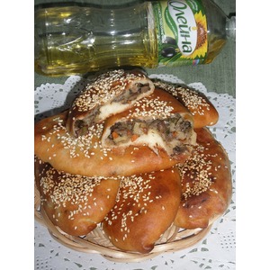 Тесто делим на кусочки. Раскатываем лепешки. Выкладываем начинку. Защипываем пирожки. Выкладываем на противень. Смазываем теплым чаем и посыпаем кунжутом. |