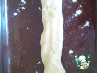 У меня два прямоугольных противня. Смазываем противни маслом и присыпаем мукой. Каждую часть скатываем колбаской по длине противня. |