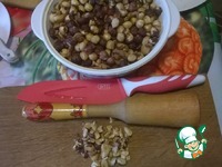 Орехи измельчаем (ножом или деревянным пестиком - по желанию). Я нарезала фундук половинками, а половинки грецкого ореха - на 6-8 частей. |