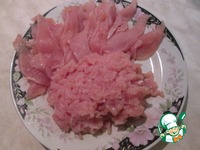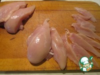 Куриное мясо снять с кости. Половину нарезать тонкими ломтиками. |