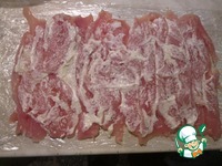 Пищевую пленку сложить минимум в пять слоев и разместить на ней ломтики куриного филе. Посолить, поперчить, смазать мягким сливочным маслом. |
