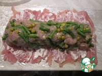 В фарш добавить фасоль, горошек и выложить его ровным" батоном " на филе. |