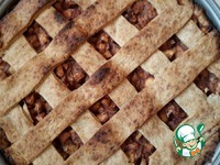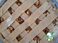 Шарик из теста раскатываем в небольшом количестве муки и разрезаем на полосы. Полученные полоски укладываем поверх начинки. |