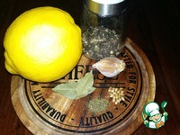 Это набор ингредиентов, которые нам понадобятся для придания скумбрии дополнительного вкуса и аромата. Из лимона выжать сок. Чеснок, кориандр и лавровый лист измельчить. |