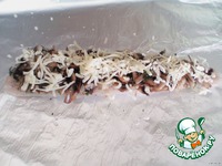 Уложить порцию жареных грибов с луком. Посыпать сыром и выпекать в хорошо нагретой духовке при 200 С 25-30 минут. |