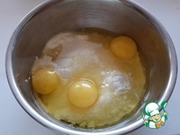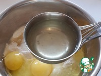 Для блинчиков смешайте муку с солью, сахаром, разрыхлителем, добавьте яйца. |