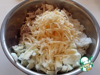 Смешайте отваренный рис, курицу, нарезанные яйца и натертый сыр - попробуйте на соль, при необходимости подсолите. Заправьте начинку растопленным сливочным маслом. |
