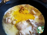 В сковороду добавить пасту карри, куркуму, кокосовое молоко и сок лимона. Все тщательно перемешать, накрыть крышкой и сделать огонь меньше. |