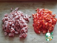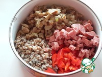 Смешайте гречку с колбасой, болгарским перцем и обжаренным луком с грибами. |
