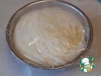 Замесите мягкое сдобное тесто, накройте его плёнкой и оставьте для подъема на 2-3 часа при комнатной температуре. В теплое место ставить не нужно, тесто должно подходить само по себе. |