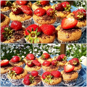 Достаем из духовки кексики, посыпаем протерым на терке черным шоколадом (он тает) и сверху декорируем клубничкой! Десерт получается очень нежный и очень вкусный!