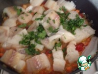 По прошествии времени выкладываем в сковороду рыбу, порезанную кусочками. Посолить, посахарить, поперчить, добавить специи и петрушку, накрыть крышкой и тушить 5-7 минут. |