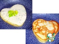 Разогрела сковороду. В центр положила разъёмную форму сердечком без дна. В форму налила две столовые ложки теста. В центр на тесто положила листок сельдерея. Жарила блин с обеих сторон до румяности. |