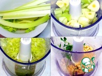 Сельдерей и чеснок измельчила в измельчителе. Не слишком мелко измельчила зелень и орехи. Лук нарезала ножницами. |