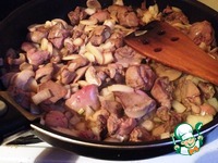 В сотейнике разогреть масло, выложить печень и обжаривать 30 секунд. Добавить репчатый лук и грибы. Готовить вместе 5 минут. |