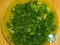 Чистим и отвариваем картошку. Пока варится картошка, измельчаем зелень и пропускаем через пресс чеснок. Перемешиваем. |