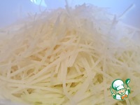 Моем и чистим овощи. Нарезаем кольраби красивыми брусочками/соломкой или натираем на тёрке для корейской моркови. |
