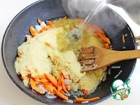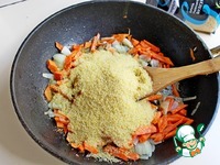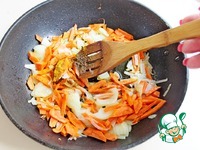 В сковороду долить 2 ст л растительного масла, выложить нарезанные на перья лук и соломкой морковь, обжаривать мин 5 до мягкости. Добавить молотый тмин и порошок карри, перемешать. |