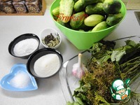 Вот такой душистый набор! Можно положить листья смородины и дуба, веточки вишни. Огурцы надо предварительно вымочить в течение шести часов. |