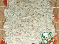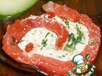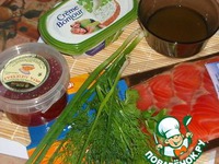 Зелень мелко порубить. Смешать творожный сыр, зелень, икру, добавить 3 чайные ложки желатинового раствора. Нанести начинку на рыбу. |