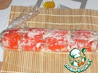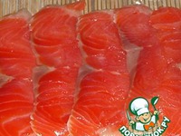 Коврик для суши застелить пищевой пленкой. Кусочки рыбы выложить на коврик, образуя единую поверхность. |