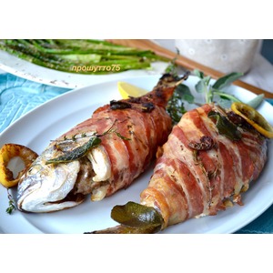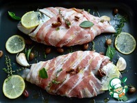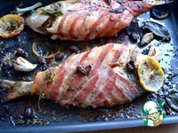 Сверху уложить дораду и завернуть её, чередуя полосочки бекона. |