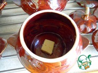 На дно чистых и сухих горшочков положить по одной чайной ложке сливочного масла. |