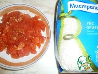 Затем к луку высыпаем рис и обжариваем. Потом добавляем помидоры, очищенные от кожуры и нарезанные кубиками, и чуть воды. Закрываем сковородку крышкой и тушим до полу готовности риса. |