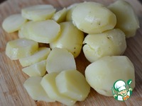 Картофель отварить в мундире. Почистить и нарезать на кружочки. |