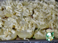 Накрываем сверху картофельными кружочками. Если используете сухой тимьян, то посыпте сверху. Я разложила несколько маленьких веточек. |