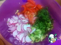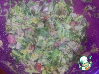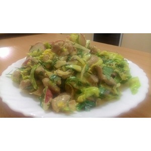 Приготовить заправку ( смешать сметану с мелко нарезанными зубчиками чеснока, перцем и карри). Смешать овощи, курицу с грибами и заправку |