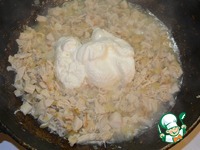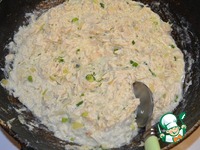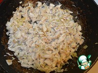 У вареных окорочков отделить мясо от костей, порезать и обжарить вместе с нарезанным луком на растительном масле. |