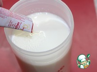 В пластиковый стакан фирменного термоса нилить молоко, всыпать сухую закваску и тщательно, в течении 2-3 минут размешать, чтобы крупинки закваски полностью растворились. |