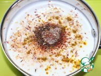 В холодный мацони добавить все указанные специи и мелкорубленный чеснок, перемешать. |