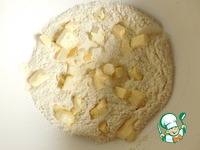 Холодное сливочное масло режем на мелкие кубики и вмешиваем в тесто. |