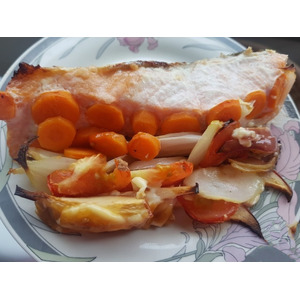 В подготовленную eмкость для выпекания выложить половину обжаренных овощей, порезанные кольцами или полукольцами помидоры и яблоки (яблоки лучше брать с кислинкой) и немного смазать майонезом, поперчить и посолить. Далее выложить разрезанное на порционные кусочки филе рыбы (с белой я не пробовала, но думаю, что будет неплохо, только надо брать не слишком жирную рыбу, ну например - сайда, треска) и тоже посолить, поперчить и смазать немного майонезом.