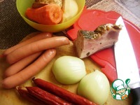 Подготовить овощи, очистить колбаски и сосиски. У меня колбаски в съедобной оболочке. |