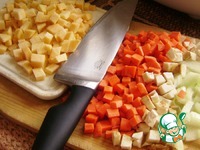 Нарезать мясные продукты кубиками, мясо немного крупнее готовых продуктов. |