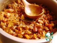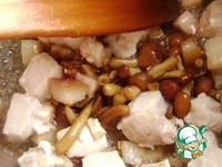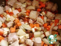 В чашу мультиварки налить масло, выложить бекон и свинину и обжарить до легкой корочки. Готовить следует на режиме жарка, под крышкой, изредка перемешивая содержимое. |